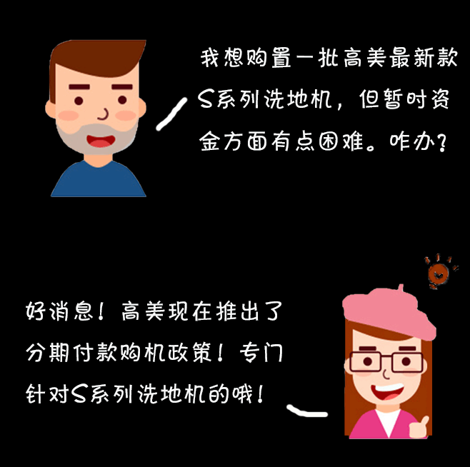 我想購(gòu)置一批高美最新款S系列洗地機(jī),但暫時(shí)資金方面有點(diǎn)困難。該如何是好?好消息!高美現(xiàn)在正好推出了分期付款購(gòu)機(jī)政策!就是專門(mén)針對(duì)S系列洗地機(jī)的哦!