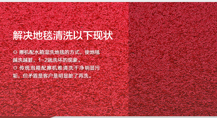 2.解決了擦機(jī)配水箱濕洗地毯的方式,使地毯越洗越臟,1-2年就洗壞的現(xiàn)象。